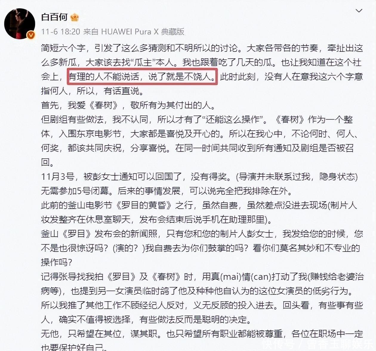 釜山电影节期间,她自费过去支持《罗目的黄昏》,却没得到应有的基本尊重自费宣传,官方发布会的照片里却几乎看不到她的身影,这不是礼节问题,是资源分配的态度问题紧接着到东日,制片人通知她“未得奖可提前回国”她订𱅀号的机日,《春树》在东京电影节闭幕式拿到最佳导演、最佳男主角两项大奖,其他主创上台领奖,她不在现场那一天她在社交平台写下八个字,像是压抑后的冒泡“还能这么操作……”